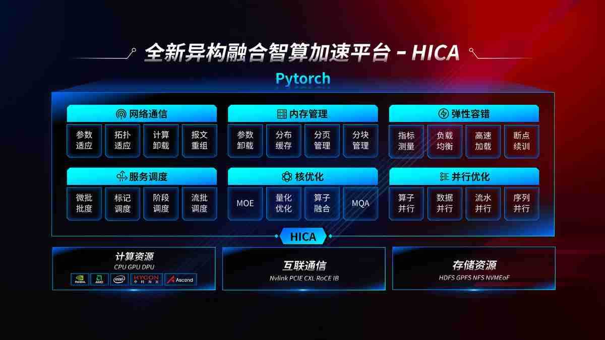 通过自研的服务层、、、中间适配层、、、、以及调度编排算法,,采用数据并行、、、模型并行等多种并行方式,,把并行计算任务进行有效的分解,,,使其分别由相应的软件栈和算力资源来承接。。。。当GPU资源变化,,,,HICA可以实时动态调度计算子任务并调整模型拓扑和架构,,以充分聚合各种算力资源。。
