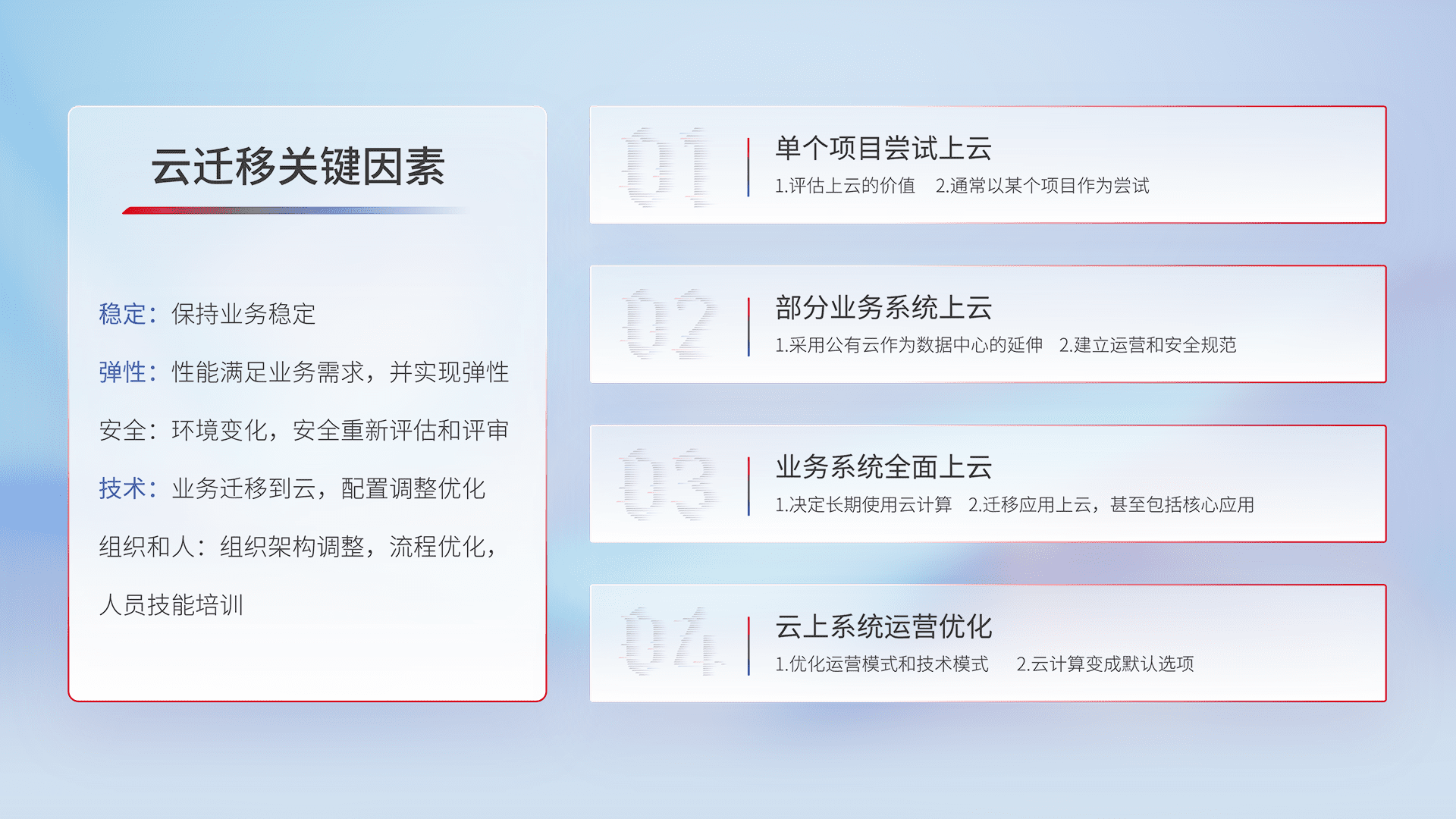 结合实际业务,,,从规划设计、、、云平台选型、、、、云原生改造、、、数据迁移、、集成交付,,,迁移全过程为客户识别最佳上云路径,,,,做好风险识别管理,,,,设计网络架构、、身份权限、、、安全审计合规、、、、操作审计、、日志审计、、、监控告警策略、、、、多站点容灾设计等,,,对云上基础设施进行整体规划,,,,提升IT治理水平,,,以满足弹性、、、高可用、、、、高性能的需求。。。。